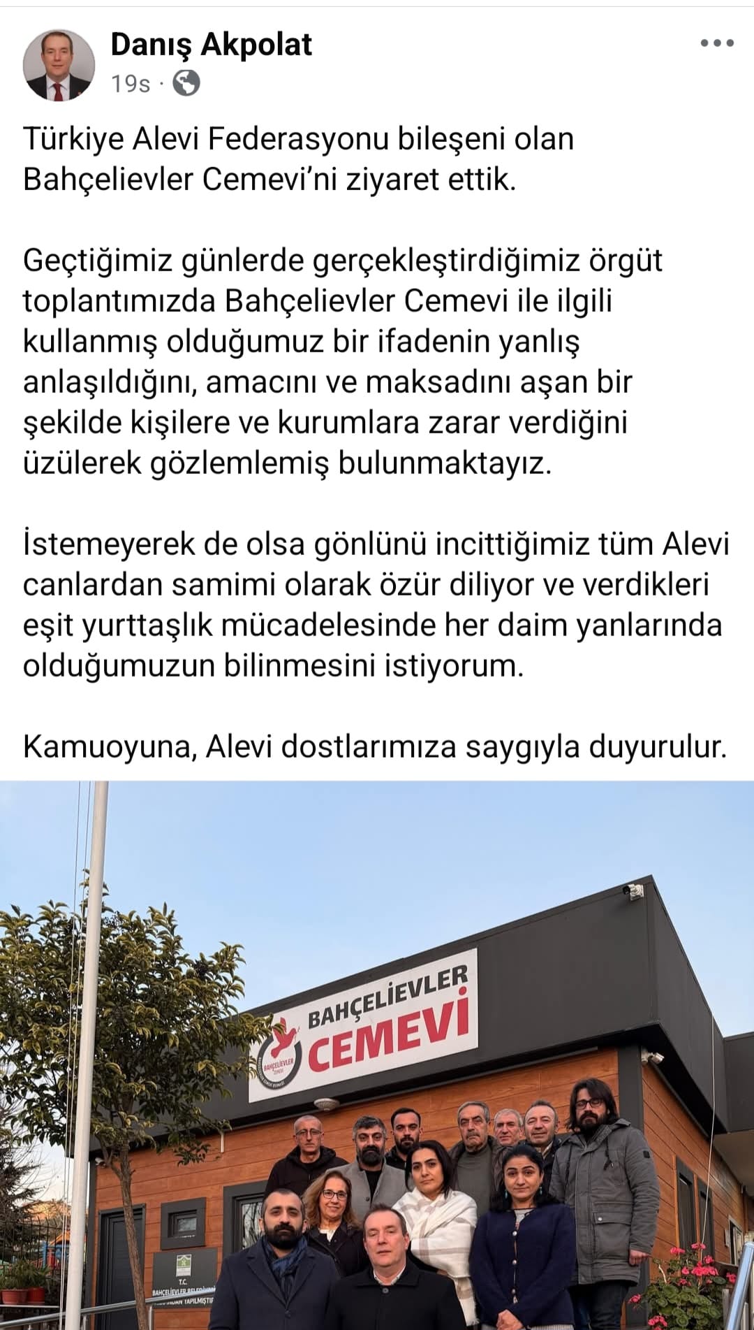 Geçtiğimiz günlerde gerçekleştirdiğimiz örgüt toplantımızda Bahçelievler Cemevi ile ilgili kullanmış olduğumuz bir ifadenin yanlış anlaşıldığını, amacını ve maksadını aşan bir şekilde kişilere ve kurumlara zarar verdiğini üzülerek gözlemlemiş bulunmaktayız.