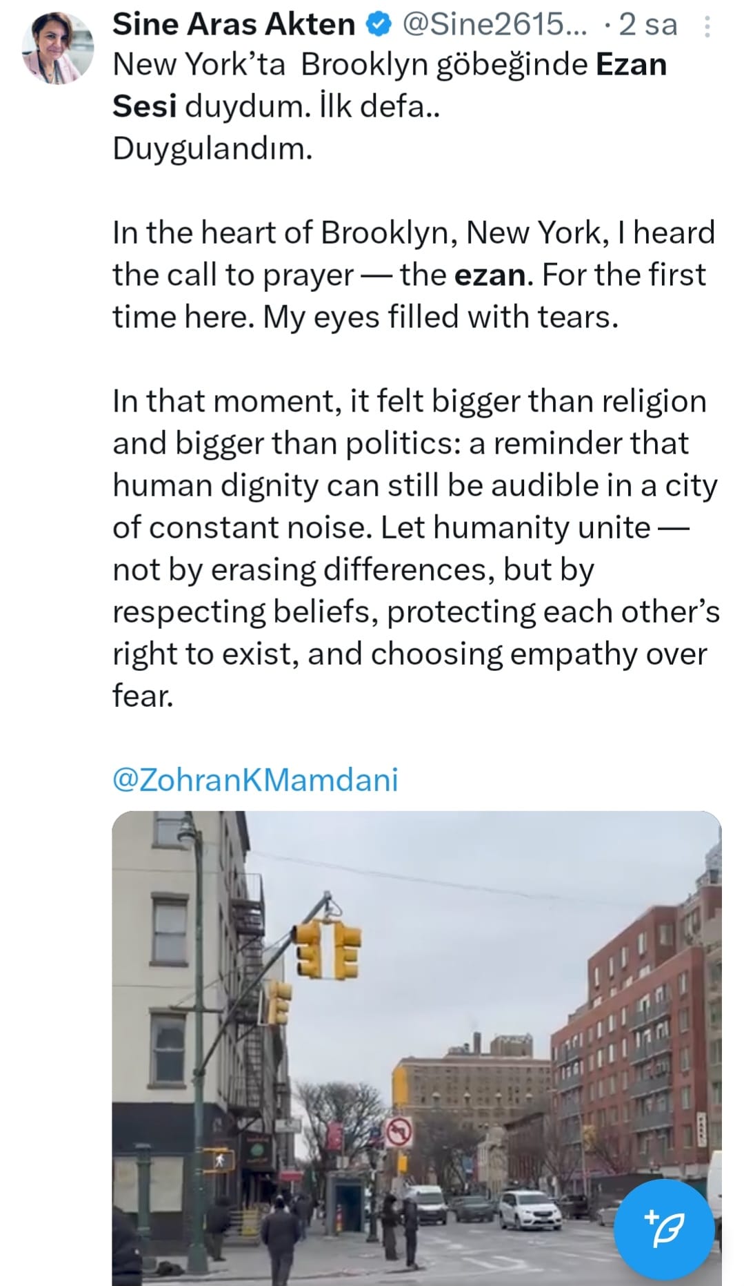 New York’ta yaşayan Türk doktor Sine Aras Akten, Brooklyn’in merkezinde ilk kez ezan sesi duyunca hemen kayda alarak sosyal medyada paylaştı. Dr. Akten paylaşımında New York Belediye Başkanı Zohran Mamdani’yi de etiketledi.